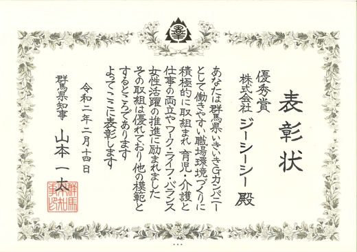 ジーシーシーは、2018年度にゴールド認証を取得しており、この度、認証されている県内企業204社(2019年12月時点)の中から、特に優れた取り組みを行う企業として優秀賞を受賞いたしました。